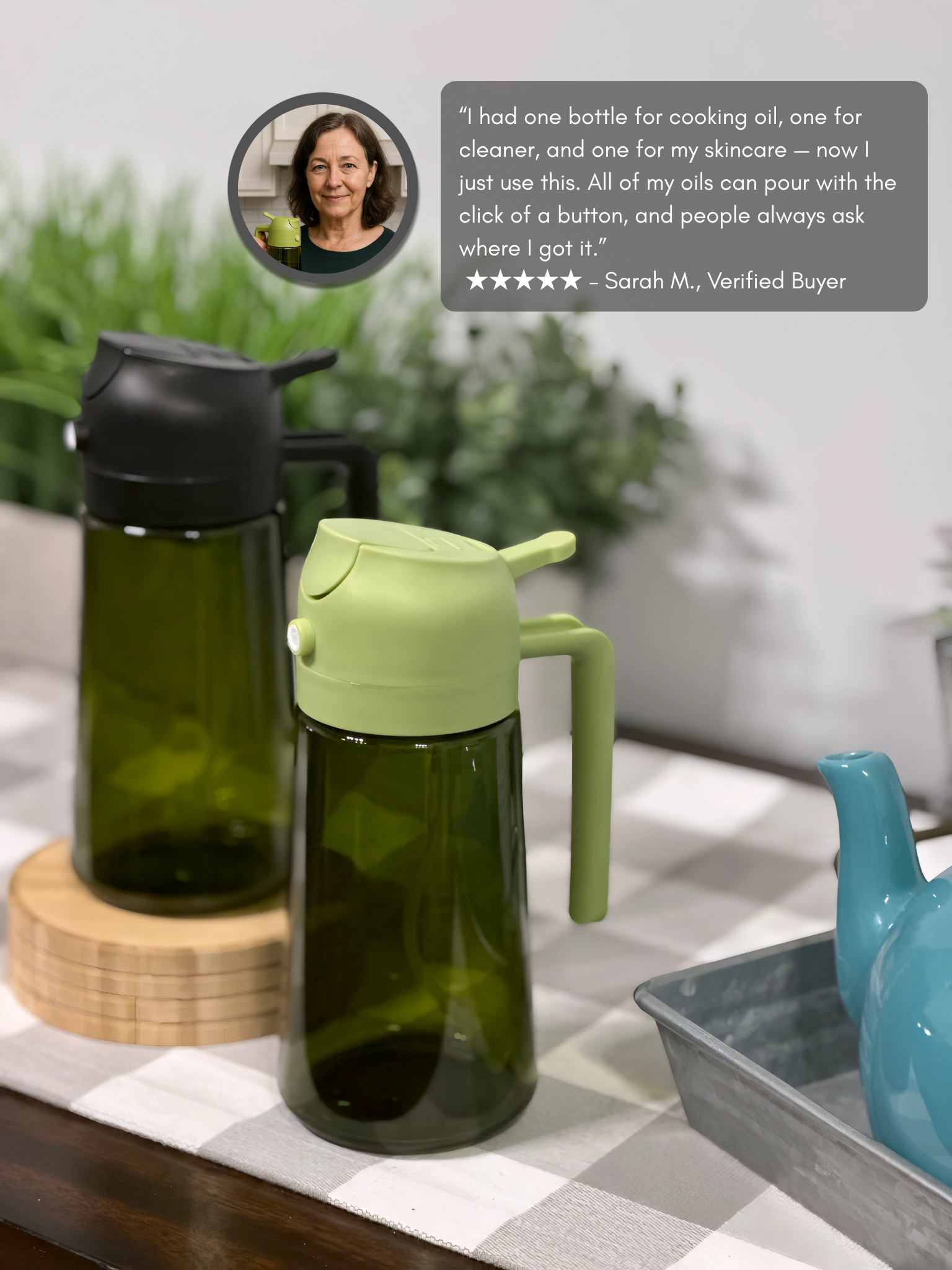 Unlike cheap plastic sprayers or messy pourers, our premium tinted glass keeps oils fresher longer, while the anti-clog filter ensures a smooth, even application for cooking, skincare, and more.